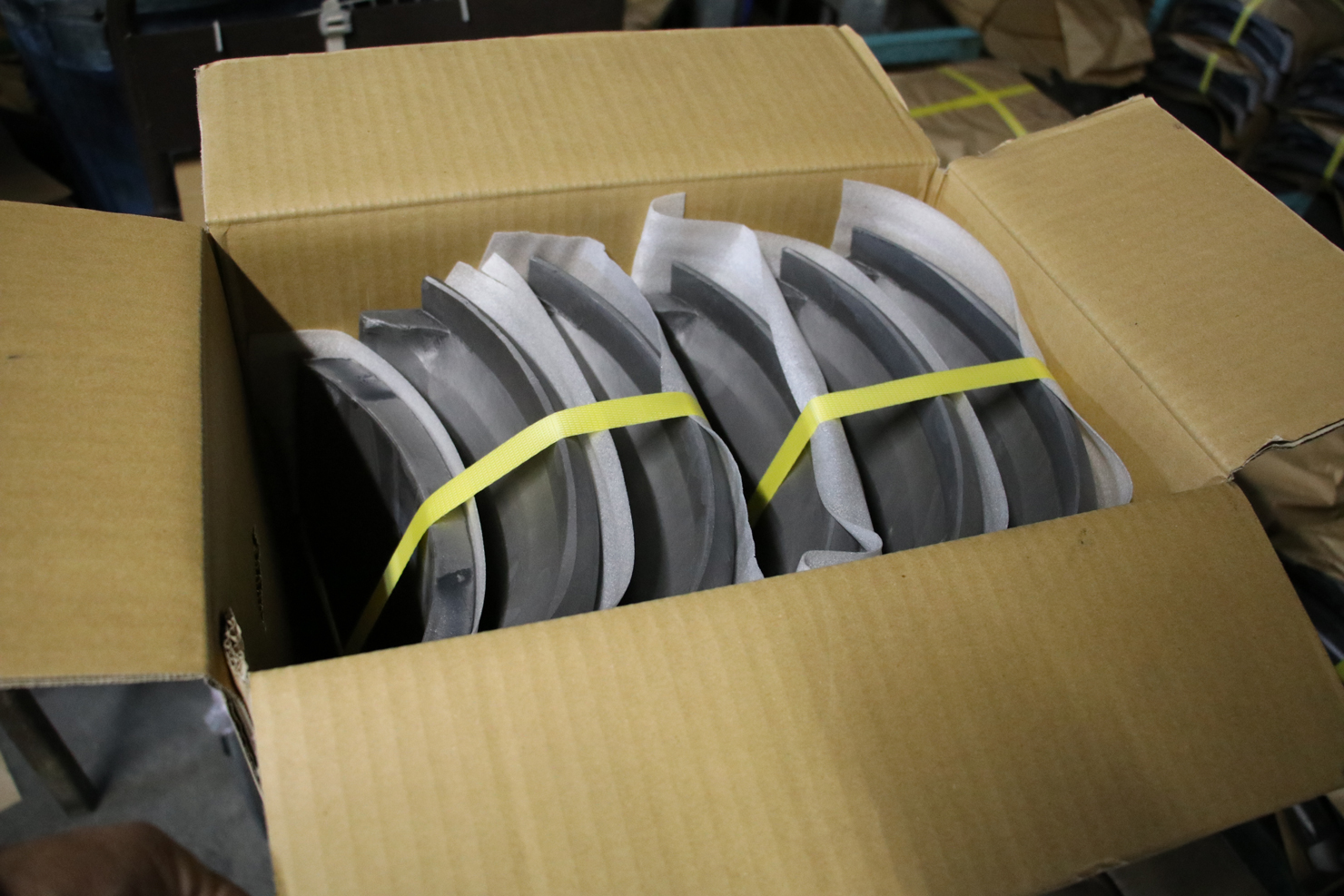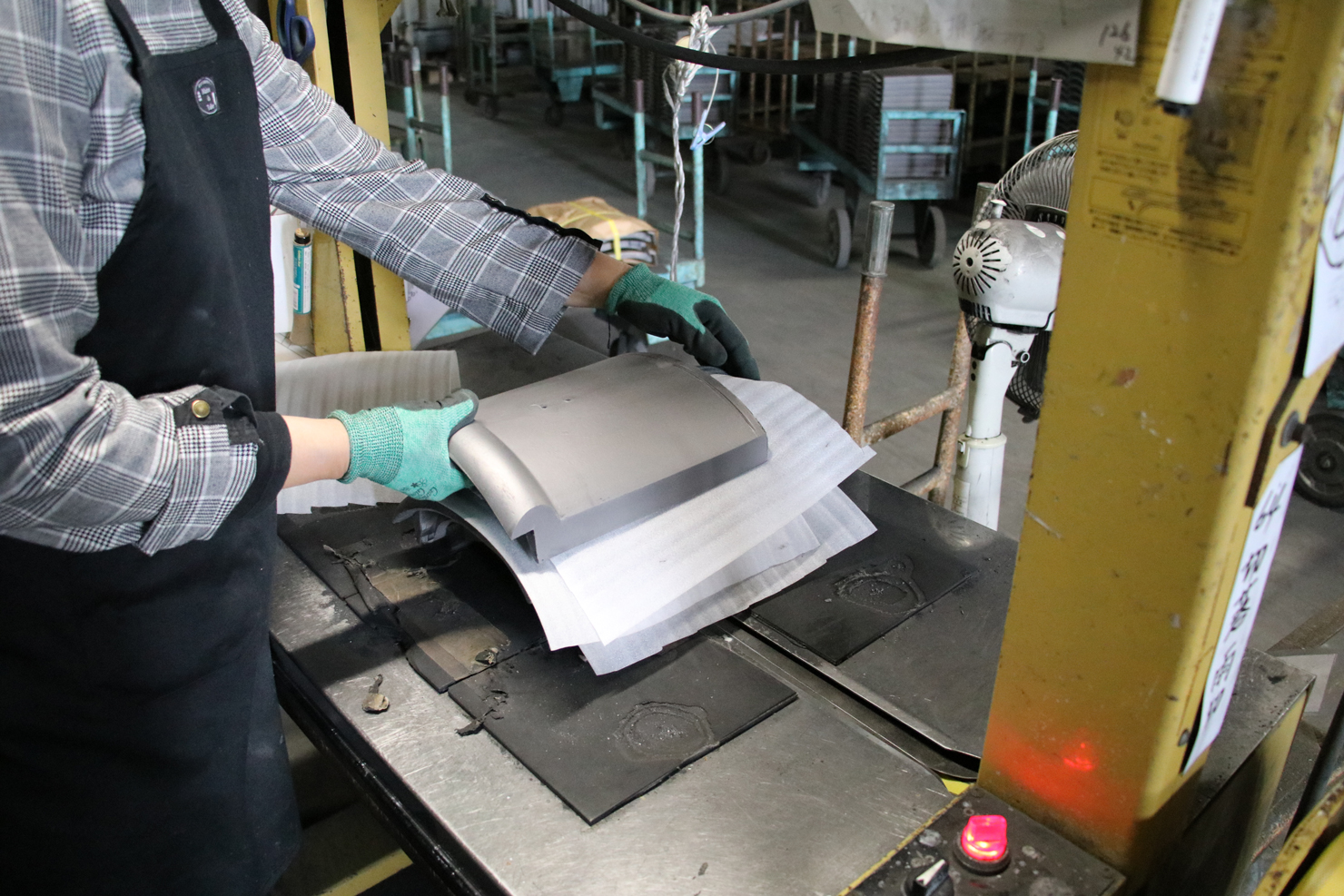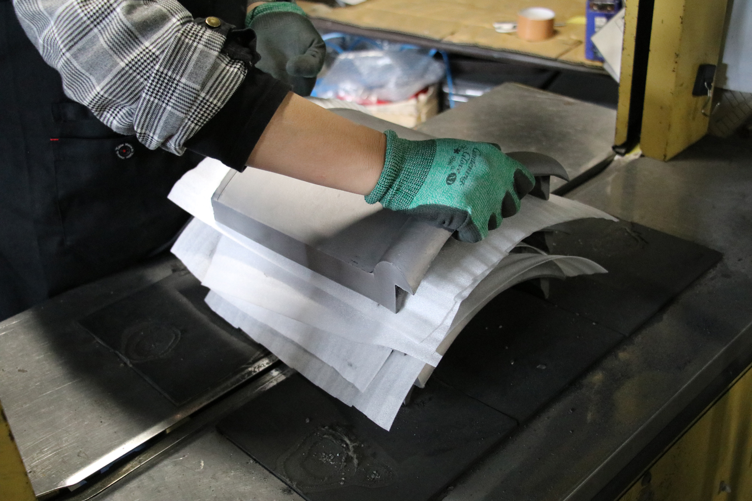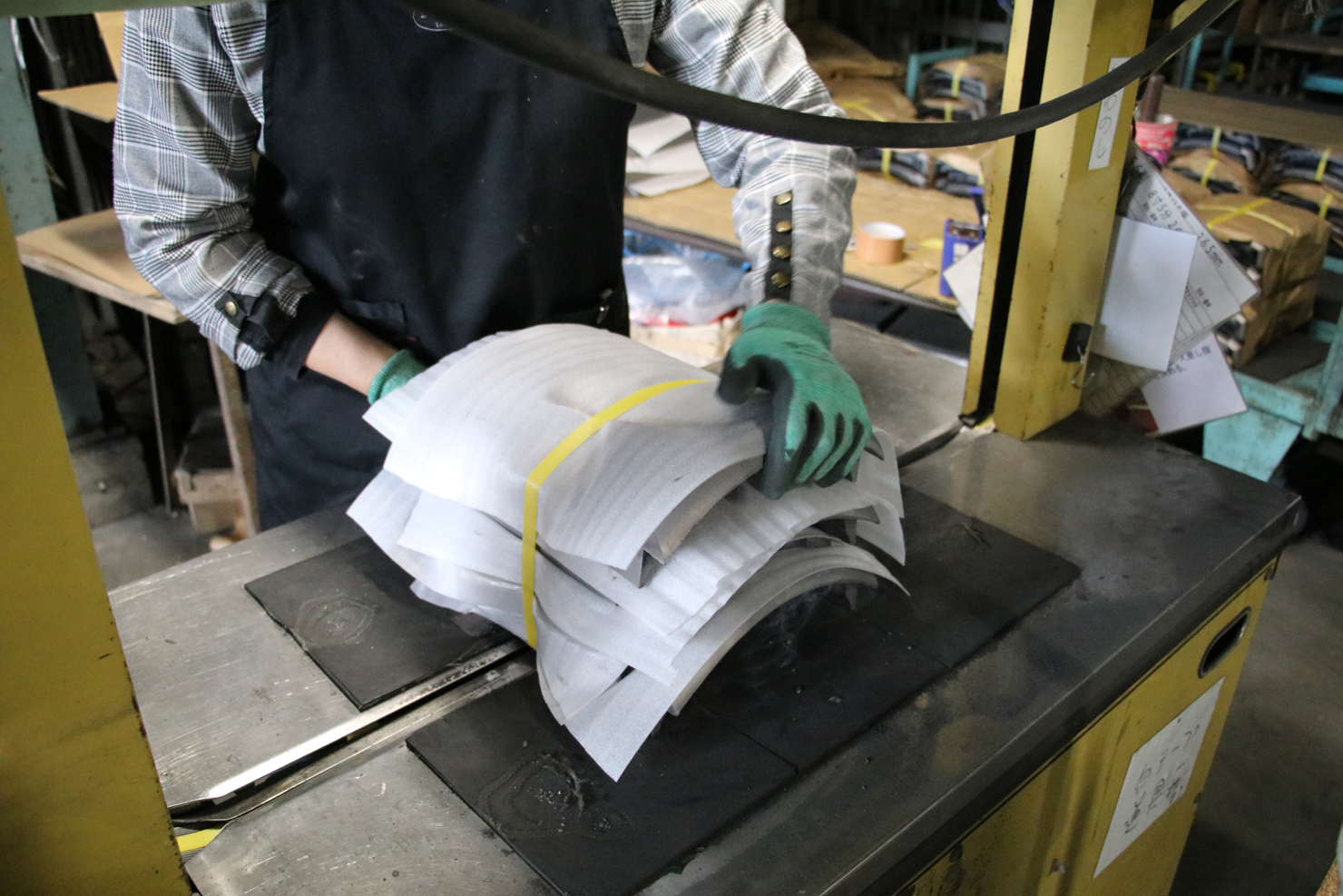 一枚ずつクッション材をあてて破損の無いように梱包していきます。